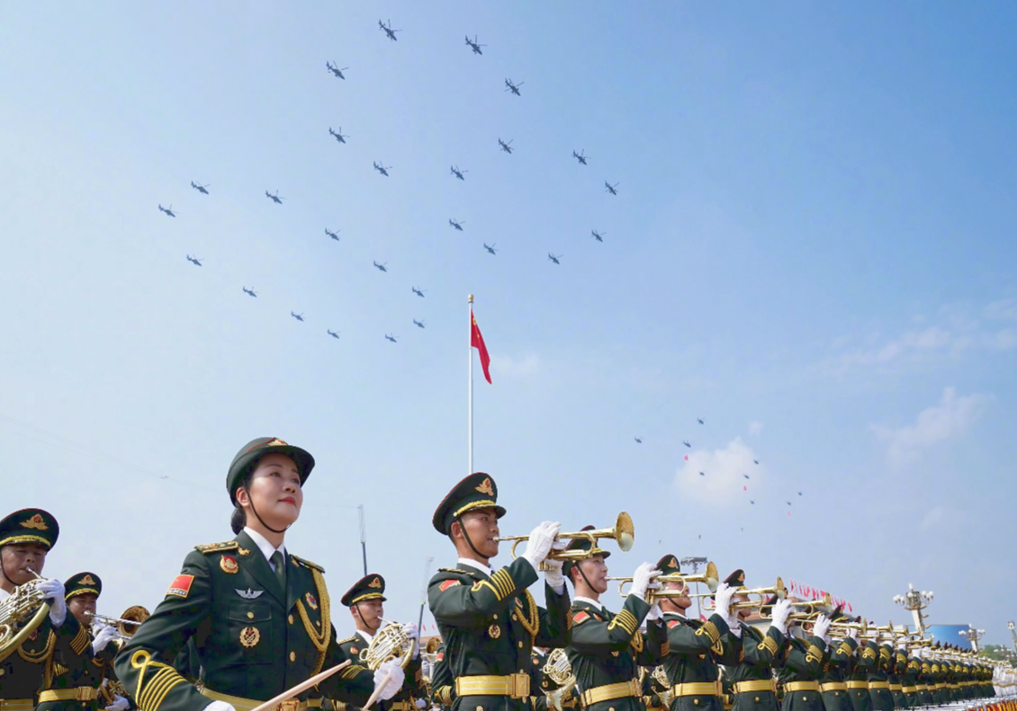 當(dāng) 1 架直 - 20 通用直升機(jī)懸掛中國共產(chǎn)黨黨旗、中華人民共和國國旗、中國人民解放軍軍旗領(lǐng)航駛來,26 架直 - 19 武裝直升機(jī)擺出 “80” 字樣定格紀(jì)念瞬間,3 架直 - 8L 運(yùn)輸直升機(jī)分別攜 “正義必勝”“和平必勝”“人民必勝” 條幅傳遞時(shí)代強(qiáng)音,7 架直 - 20T 直升機(jī)圍繞標(biāo)語組成三角隊(duì)形護(hù)航,依次通場。既是對歷史勝利的總結(jié),也是對未來發(fā)展的堅(jiān)定信念。